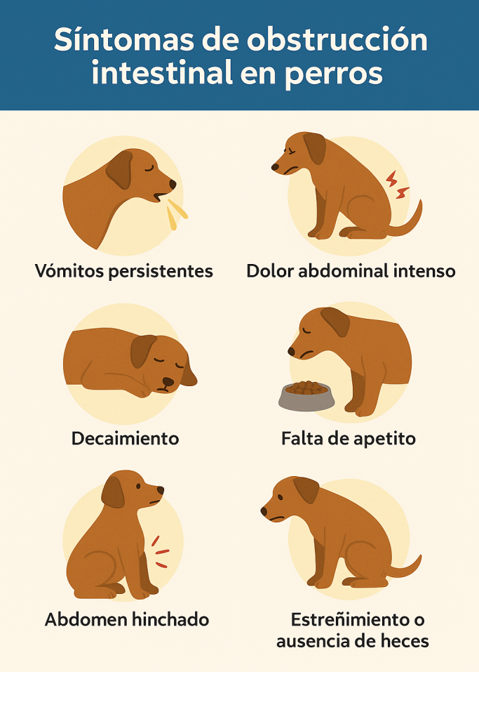 La obstrucción intestinal en perros puede causar una variedad de síntomas, que incluyen:
